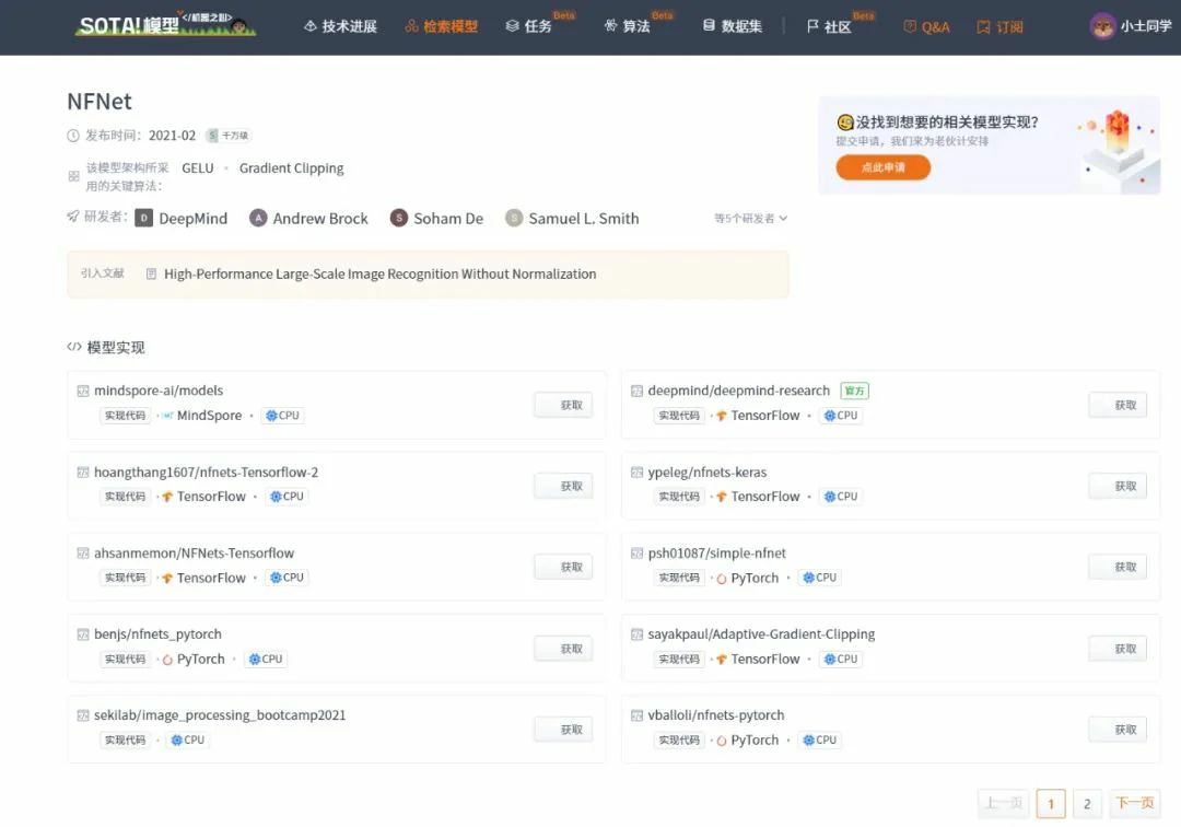 当前 SOTA!平台收录 NFNet 共 15 个模型实现资源,支持的主流框架包含 TensorFlow、PyTorch、MindSpore、JAX 等。