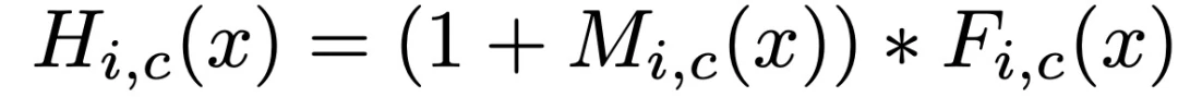 由此,作者提出了 Attention Residual Learning。如果 soft 掩码单元可以被构造成相同的映射,那么其性能应该不会比没有注意力的对应单元差。因此,将注意力模块的输出 H 修改为: