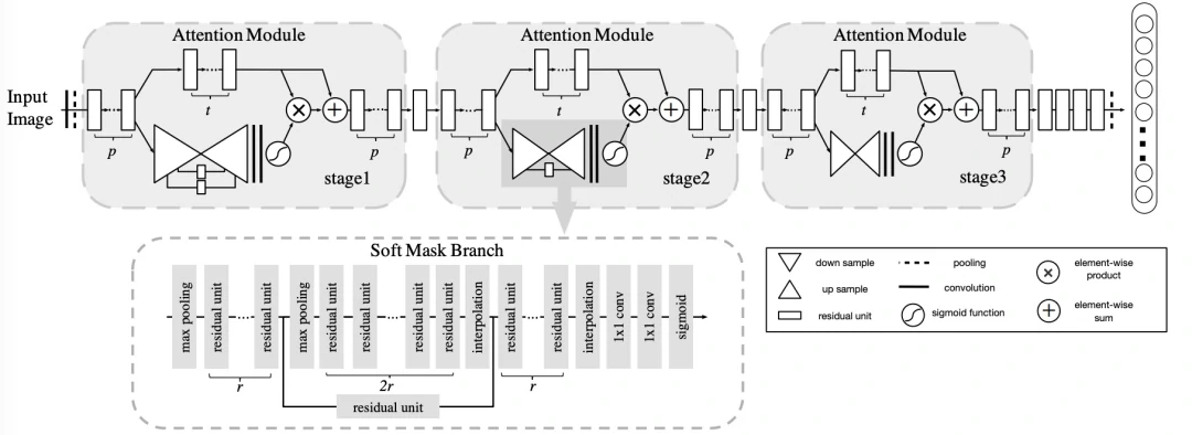 掩码分支包含快速前馈扫描和自上而下的反馈步骤。前一种操作快速收集整个图像的全局信息,后一种操作将全局信息与原始特征图结合在一起。在卷积神经网络中,这两个步骤展开为自下而上、自上而下、完全卷积的结构。从输入开始,执行几次 max-pooling,以在少量 Residual Units 后迅速增加感受野。达到最低分辨率后,全局信息将通过对称的自上而下的体系结构进行扩展,以指导每个位置的输入特征。在 Residual Units 之后对输出进行线性插值上采样。双线性插值的数量与 max-pooling 的数量相同,以使输出大小与输入特征图相同。然后,在两个连续的 1x1 卷积层之后,sigmoid型层将输出范围归一化为 [0, 1] 。作者还在自下而上和自上而下的部件之间添加了跳接,以捕获不同比例的信息。完整的模块如下图所示。使用三个超参数来设计注意力模块:p,t,r 。超参数 p 表示在分解为主干分支和掩码分支之前的预处理 Residual Units数。t 表示主干分支中的 Residual Units 数。r 表示掩码分支中相邻池化层之间的Residual Units 数。一个 Attention 模块是一个 stage。