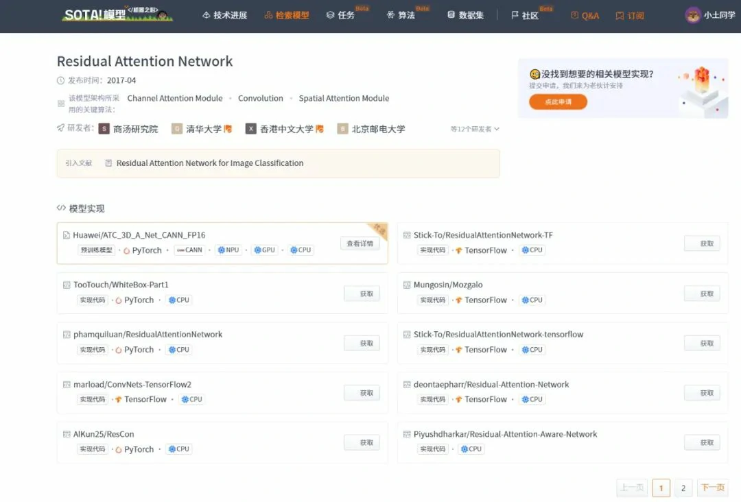 当前 SOTA!平台收录 Residual Attention Network 共 15 个模型实现资源,支持的主流框架包含 TensorFlow、PyTorch、CANN 等。