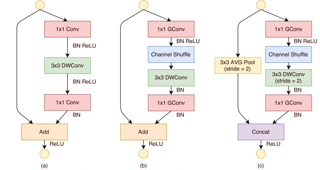 基于上面的设计理念构造 ShuffleNet 的基本单元,如图 3 所示。ShuffleNet 的基本单元是在一个残差单元的基础上改进而成的。如图 3(a)所示,这是一个 3 层的残差单元:首先是 1x1 卷积,然后是 3x3 的 depthwise convolution(DWConv,主要是为了降低计算量),这里的 3x3 卷积是瓶颈层(bottleneck),紧接着是 1x1 卷积,最后是一个 shortcut,将输入直接加到输出上。