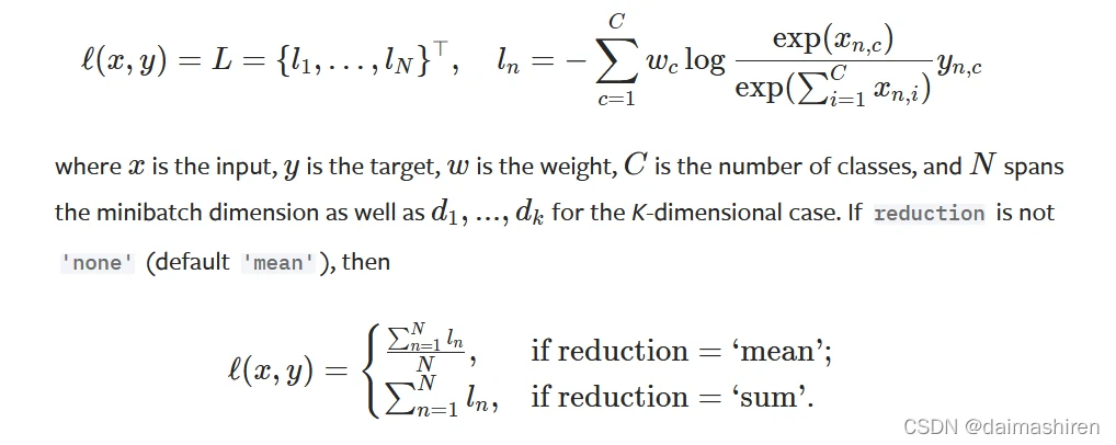 可以看出效果是一样的,这是因为在pytorch的代码实现中,交叉熵的计算公式为: