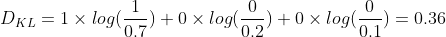 深度学习中,常用KL散度衡量两个数据分布之间的差异,KL散度越小,则表示两个数据分布之间的差异越小。一般以 P(x) 表示样本的真实分布,Q(x)作为模型预测的分布。例如,在一个三分类任务中,x1,x2,x3分别表示猫、狗和马。若一张猫的图片的真实分布P(x)=[1,0,0],而预测分布为Q(x)=[0.7,0.2,0.1],则对应的KL散度计算如下:
