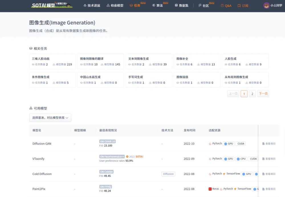 图像生成也是深度学习模型应用比较广泛、研究程度比较深的一个主题,大量的图像库也为SOTA模型的训练和公布奠定了良好的基础。在几个著名的图像生成库中,例如CIFAR-10、ImageNet64、ImageNet32、STL-10、CelebA 256、CelebA64等等,目前公布出的最好的无条件生成模型有StyleGAN-XL、Diffusion ProjectedGAN;在ImageNet128、TinyImageNet、CIFAR10、CIFAR100等库中,效果最好的条件性生成模型则是LOGAN、ADC-GAN、StyleGAN2等。