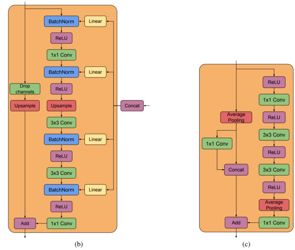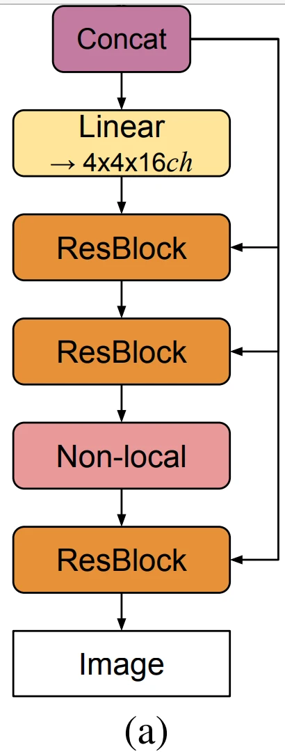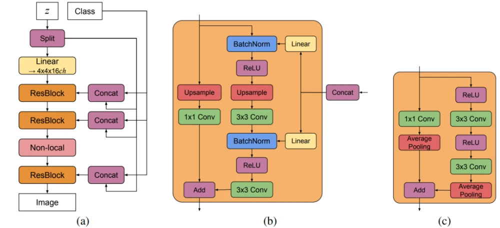 图2. (a) BigGAN的典型架构;(b) G中的残差块(ResBlock up);c)D中的残差块(ResBlock down)