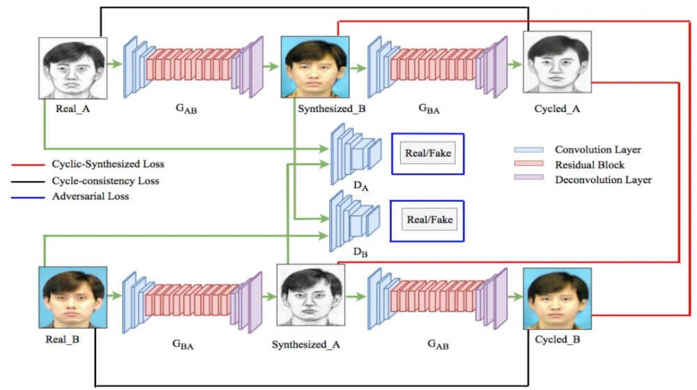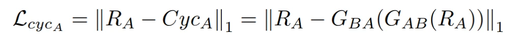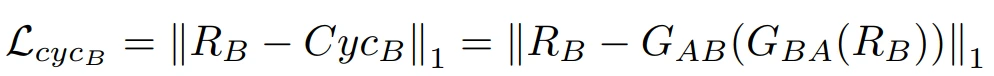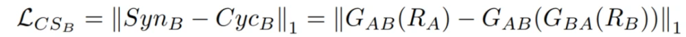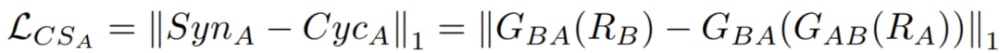 如图4所示,CSGAN方法的总体工作是将图像R_A从域A转化为B,并将其交给生成器网络G_AB,从而得到合成的图像S_ynB。将合成的图像S_ynB从域B转化为原域A,并将其交给生成器网络G_BA,得到循环的图像C_ycA。以同样的方式,来自B域的真实图像R_B首先被转换到A域作为合成图像S_ynA,然后通过使用生成器网络G_BA和G_AB分别转换回B域作为循环图像C_ycB。鉴别器网络D_A用于区分真实图像R_A和合成图像S_ynA。同样地,鉴别器网络D_B用于区分真实图像R_B和合成图像S_ynB。为了生成最接近真实图像的合成图像,它们之间的损失要最小化。这就意味着需要有高效的损失函数。CSGAN引入了一种新的损失函数循环合成损失(CS loss),它可以在降低伪影的情况下提高结果的质量: