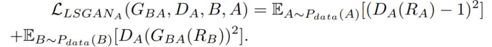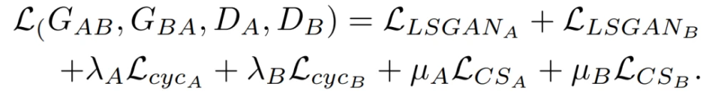 其中,L_CSA是A域(即S_ynA和C_ycA之间)的循环合成损失,L_CSB是B域(即S_ynB和C_ycB之间)的循环合成损失。CSGAN方法的目标函数(L)结合了所提出的Cyclic-Synthesized损失与现有的Adversarial损失和Cycle-consistency损失,如下所示: