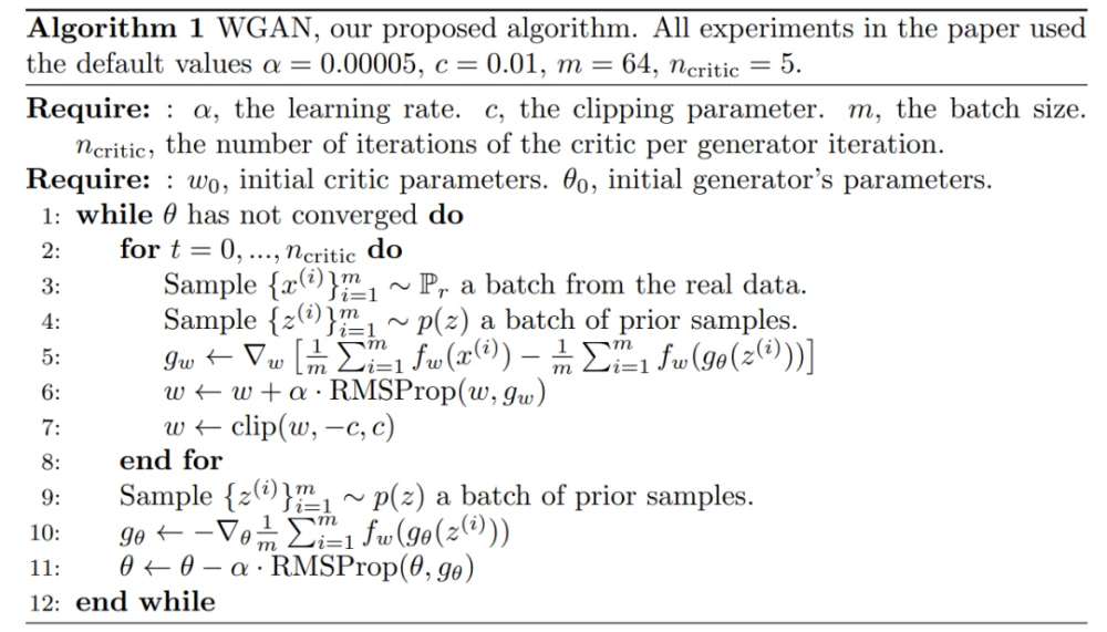 与原始的GAN相比,WGAN的鉴别器D的作用是一个EM距离的计量器,因此鉴别器越准确,对生成器越有利,可以在训练一个Step时训练D多次,训练G一次,从而获得较为准确的EM距离估计。WGAN的算法流程如下述Algorithm 1。