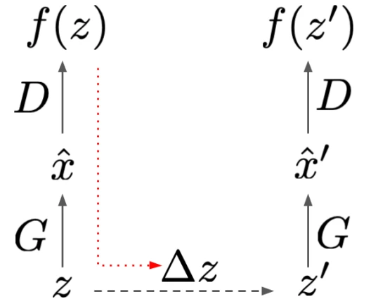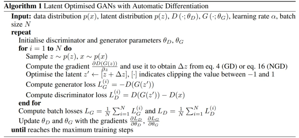 图5. LOGAN示意图。首先计算一个通过G和D的前向传递,有一个 sampled latent z,然后,使用来自生成器损失的梯度(红色虚线箭头)来计算一个改进的latent z’。在第二次正向传递中使用这个改进的latent后,通过latent优化计算出鉴别器的梯度,返回到模型参数θ_D、θ_G中