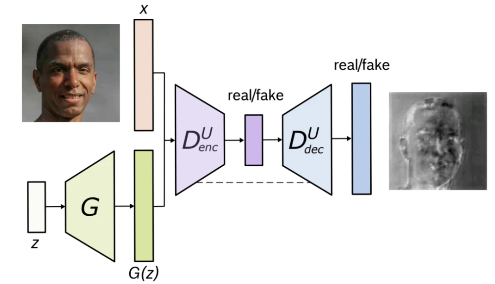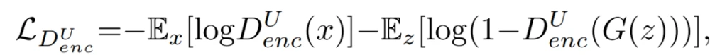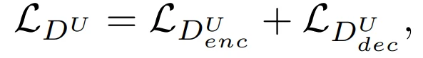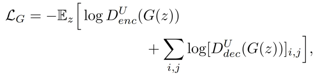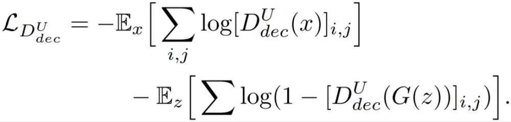 Unet-GAN通过重复使用原鉴别器分类网络的构件作为编码器部分,以及生成器网络的构件作为解码器部分,来扩展鉴别器形成一个U-Net,即,鉴别器现在由原来的下采样网络和一个新的上采样网络组成。这两个模块通过一个瓶颈连接,以及,从编码器和解码器模块复制和串联特征图的skip connections。将分类器表征为D^U。原始的D(x)将输入的图像x分类为真实和虚假,而U-Net鉴别器D^U(x)则在per-pixel层面额外执行这种分类处理,将图像x分割为真实和虚假区域,同时还有来自编码器的x的原始图像分类。这使鉴别器能够学习真实和虚假图像之间的全局和局部差异。把鉴别器的原始编码器模块称为(D^U)_enc,把引入的解码器模块称为(D^U)_dec。现在,新的鉴别器损失可以通过从(D^U)_enc和(D^U)_dec中获取决策来计算: