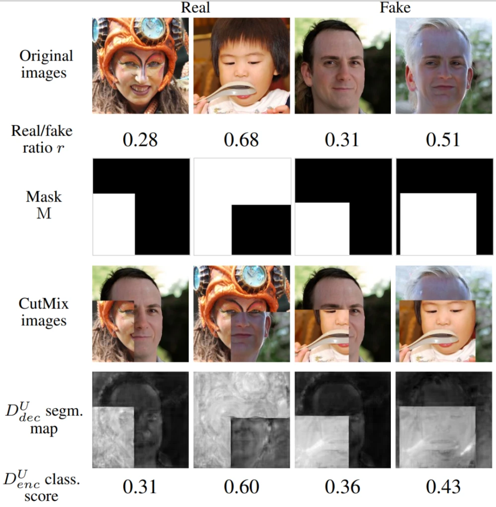 图7. CutMix增强和U-Net鉴别器对CutMix图像的预测的可视化。第一行:真实和虚假的样本。第二行和第三行:采样的真/假CutMix比率r和相应的二进制掩码M(颜色代码:白色为真,黑色为假)。第四行:从真实和虚假样本中生成的CutMix图像。第5行和第6行:相应的真/假D^U的分割图及其预测的分类分数