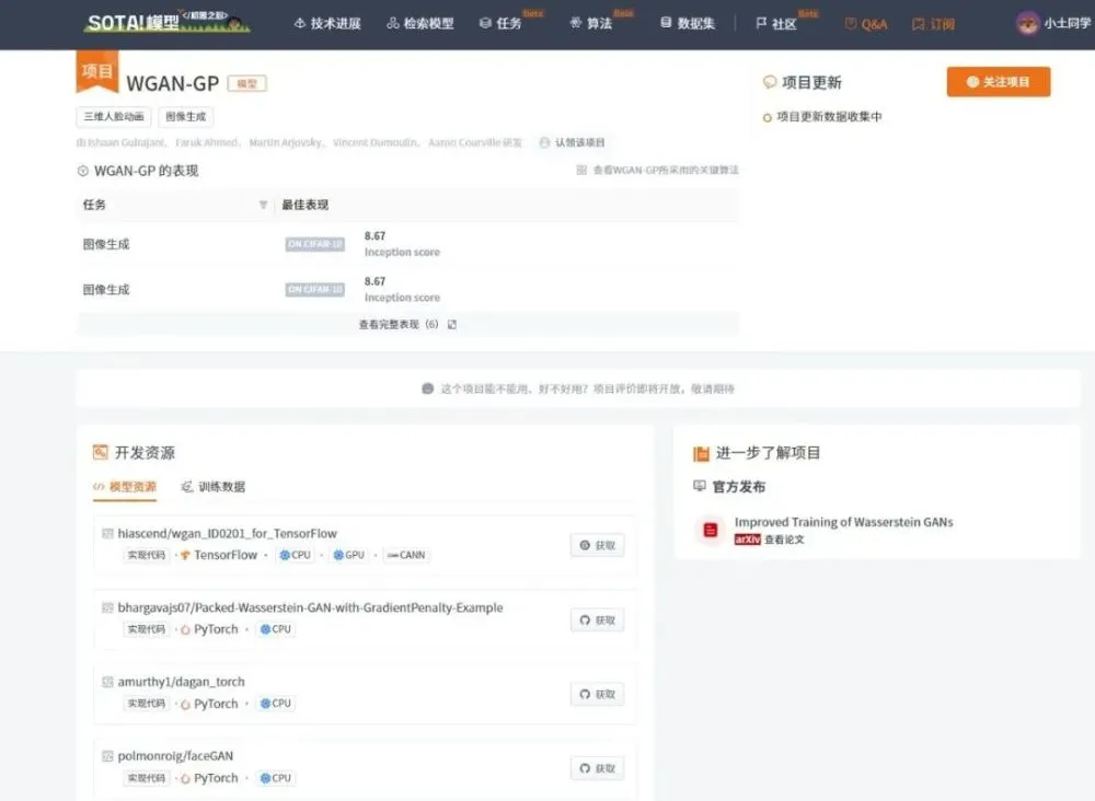 当前 SOTA!平台收录 WGAN 共 96 个模型实现资源。