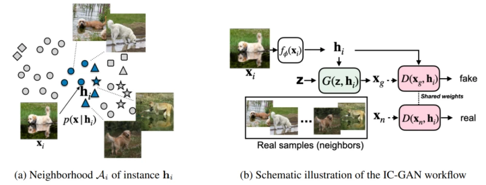 图8. IC-GAN。(a) 生成器的目标是生成与h_i的邻域相似的现实图像,在嵌入空间中使用余弦相似度定义。图中显示了七个邻居中的五个。请注意,同一邻域的图像可能属于不同的类别(被描述为不同的形状)。(b) 以实例特征h_i和噪声z为条件,生成器产生一个合成样本x_g。生成的样本和真实样本(h_i的邻居)被送入鉴别器,鉴别器以相同的h_i为条件
