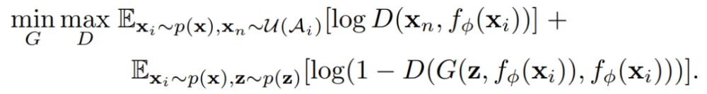 在IC-GAN中,采用对抗式方法来训练生成器,因此可以联合训练生成器和鉴别器,鉴别器用来区分h_i的真实相邻节点和生成的相邻点。对于每个h_i,真实邻居都从A_i中均匀采样。生成器 G和鉴别器 D都参与了一个两人最小-最大博弈,在博弈中,二者试图找到目标的纳什均衡的等式。