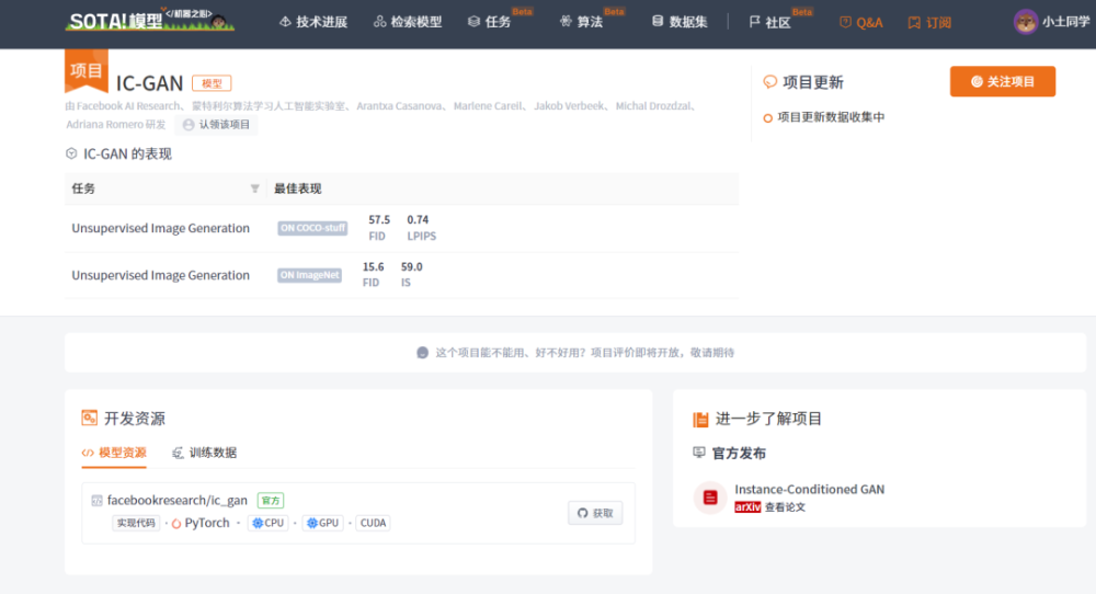 当前 SOTA!平台收录IC-GAN 共 1 个模型实现资源。