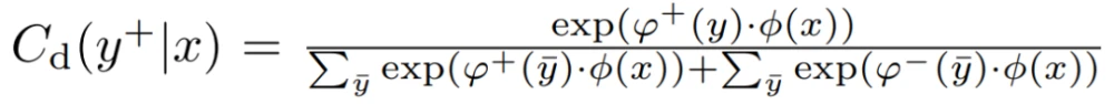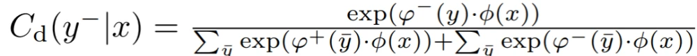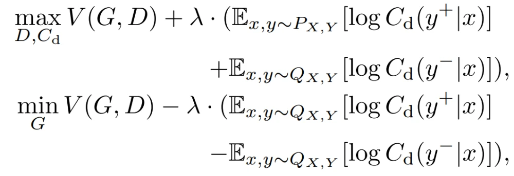 其中,C_d表示数据x被判别性分类器同时归类为标签y和真假的概率。φ : X → Rd是一个特征提取器,与原始鉴别器共享(D = σ ◦ ψ ◦ φ,具有线性映射ψ : Rd → R和sigmoid函数σ : R → [0, 1]),ϕ+ : Y → Rd和ϕ- : Y → Rd捕获负责真实和生成数据的标签的可学习嵌入。log C_d(y+|x)的最大化鼓励生成器只生成少数标签一致的数据,促进了保真度,但失去了生成样本的多样性。另一方面,log C_d(y-|x)的最小化鼓励生成器不合成典型的标签一致的数据,增加多样性,但可能降低生成样本的保真度。