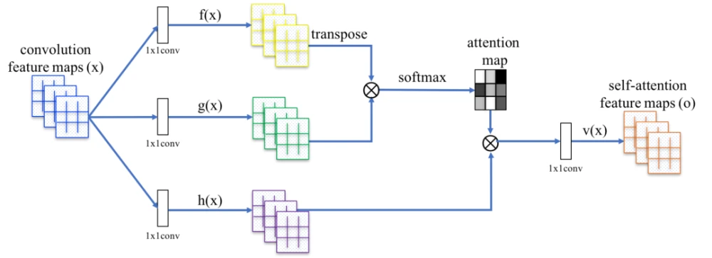 图1 SAGAN的自注意力模块。⊗表示矩阵乘法,对每一行进行softmax操作