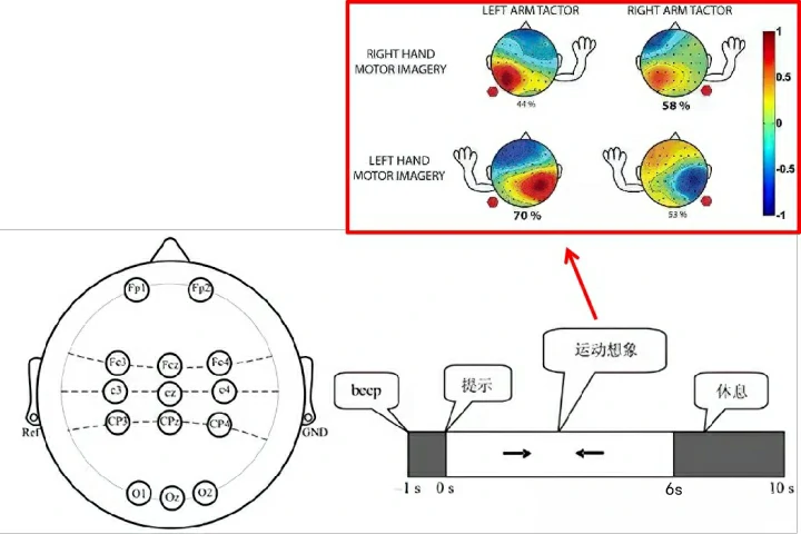 基于运动想象的系统主要是将运动想象激发大脑运动皮层脑电节律变化的脑电信号作为输入,通过信号处理部分判断运动想象种类,然后由计算机将运动想象种类翻译成控制命令,最终可以实现人脑与外部设备的通信及控制功能。主要关注的是用于优化被试表现的特征提取和分类技术。早期 BCI 原型是基于进行有意的肢体运动期间的 EEG 模式,比如左手、右手或者脚的运动。