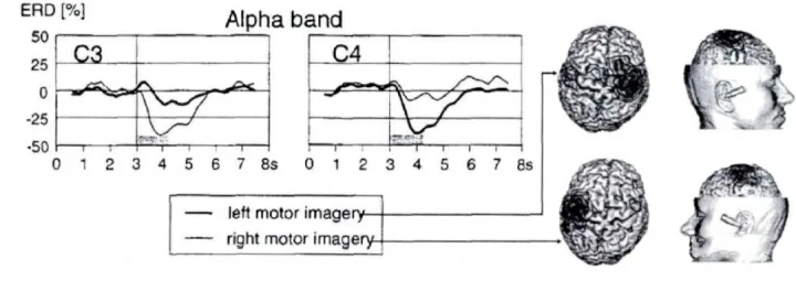 图片来源于书籍《脑机接口导论》。a.运动想象期间,alpha频带的平均能量(此处指913Hz,称为运动区mu频带),EEG信号来自左侧(C3)和右侧感觉运动皮质(C4)。相对于基线(0.52.5秒)的正、负偏移分别表示频带能量的增加(ERS)和减少(ERD)。在3秒时出现提示并持续1.25秒的时间;b.根据实际的头模型计算出皮质表面在提示出现后625毫秒的ERD分布(改编自Pfurtscheller等人,2000)。