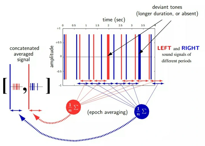 研究人员对 P300 的 BCI 进行了改进,探索了将 oddball 范式应用于听觉刺激,以此为基础构建 BCI 系统。听觉刺激由不同频率、时长为 50 毫秒的方波产生的哔哔声构成,哔哔声产生于被试的左侧或右侧。这段哔哔声中包含两种声音,一种是会频繁响起的非目标哔哔声,另一种是偶尔才在被试任一耳朵中独立播放的目标哔哔声。被试的任务是注意(通过计数)在左耳或右耳中响起的目标刺激。BCI 需要检测被试正在留意的是哪个目标(左耳的目标或右耳的目标)。对多次试验中的 39 通道 EEG 信号进行平均,利用 ICA 进行分离,然后用线性 SVM 进行分类。