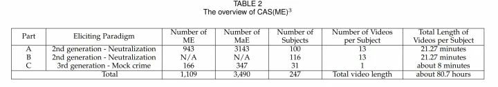 2018年发布,其进一步扩展,增加了受试者的宏观表情和微观表情样本,数据集被划分为A、B两部分,A中有87个包含微表情和宏表情的长视频,B中有300个宏表情样本,57个微表情样本。情感类型包含三分类 positive, negative, surprise and others 或更细致的 anger,sadness ,anger, fear, disgust,happiness,surprise ,helpless,pain,confused,happyiness,sympathy。