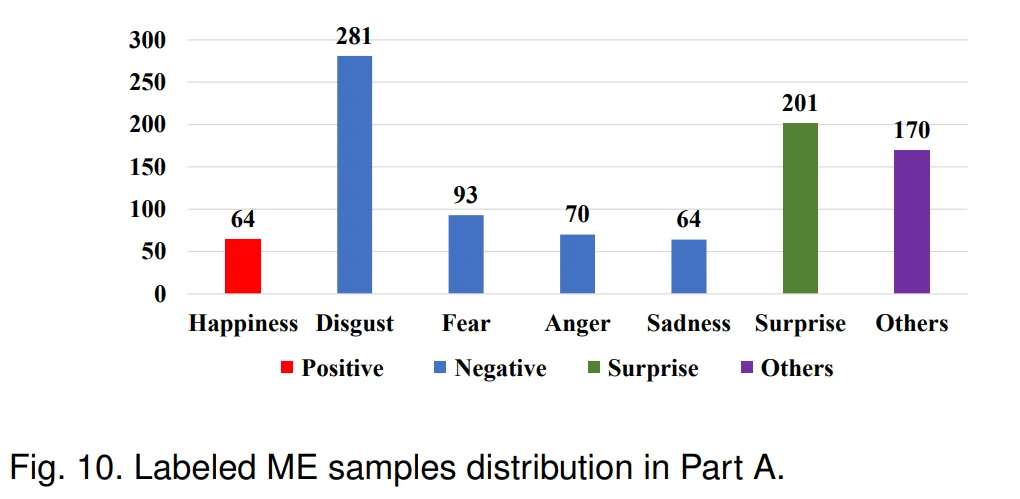 - 微表情样本标签包含7种情感类型, Happiness (64 samples), Disgust (281), Fear(93), Anger(70), Sadness(64), Surprise (201) and Others (170)