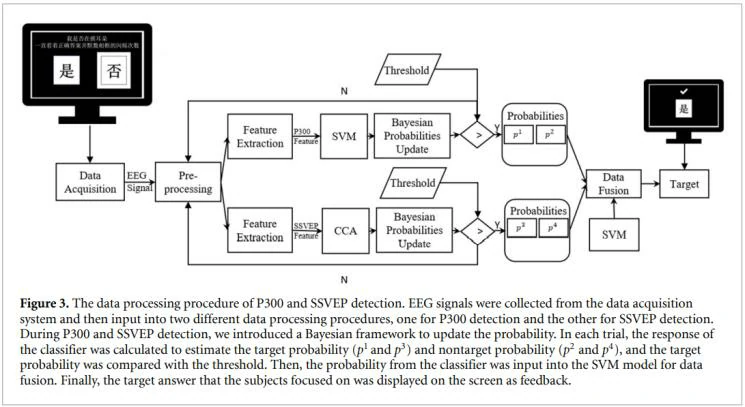 第一步,离线训练:在进行在线实验之前,每个受试者进行一次由10次试验组成的训练。两个方块的答案以不同的频率闪烁显示(唤起与左/右方块相关的SSVEPs),方块框也以随机的顺序闪烁(唤起与左/右方框相关的P300电位),每次出现持续200毫秒,每800毫秒一次。每个试验有五个回合。试验开始时有8秒的视听指令。在指示过程中,被试遇到了一个情景问题,如 “我现在是不是在摸我的鼻子。受试者被要求注意表示答案的方块,并计算相应的方块框架闪动的次数。训练阶段的数据被用来训练最初的P300和SSVEP模型。对于P300检测,用RBF核函数的SVM模型来训练这些数据。对于SSVEP检测,训练了一个CCA模型。