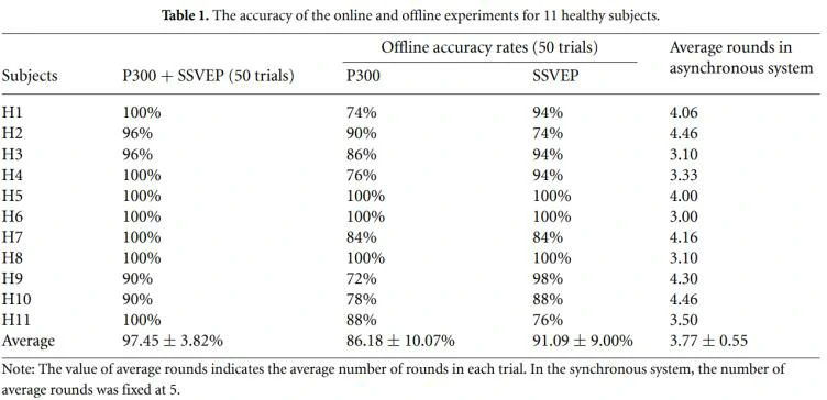 实验还表明,混合异步BCI系统的表现优于纯P300和纯SSVEP系统。作者采用的异步动态收集脑电图信号的方法与同步系统相比,平均所需回合数减少21%,在线实验时间减少105秒。