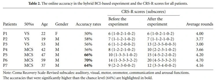 该表列出了混合系统的在线准确率和每个病人(包括3个VS和4个MCS)的CRS-R分数。