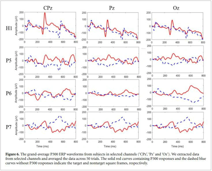 从图中可看出通过使用BCI系统,三名患者(p5、p6、p7)对目标刺激的明显P300反应。