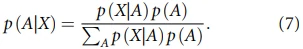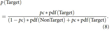 在在线阶段,贝叶斯的异步方法被应用于动态停止。首先,对目标和非目标闪烁的分类器反应分数进行分组。再对分组的分类器分数进行缩放,并使用核密度估计进行平滑处理,最后生成目标反应和非目标反应的似然概率密度函数pdfs。在贝叶斯框架中,pdfs被用来更新每个周期的概率。在在线实验中,闪烁的初始化概率p(A)=1/2。在每一轮新的闪烁中,反应概率通过贝叶斯推理更新:公式(6)。但作者把总概率p(X)改为每个闪烁的概率之和:公式(7)。每次贝叶斯概率更新之后,每个闪烁的概率都与一个阈值进行比较。这个阈值表示基于信噪比的答案是正确的信心:公式(9)。每轮实验的目标是找到目标答案所以将分类器的反应通过公式(8)转化为最终答案的概率。