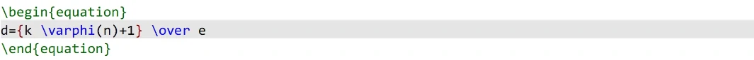 对于复杂的公式,则需要熟记公式中经常用到的一些指令,比如RSA公式为例:\over代表几分之几,分子在前分母在后,由于这里的分子是另一个表达式,所以需要用花括号括起来,但这里的花括号并不会直接显示在最终的公式中,\varghi在这里代表小写的符号φ,\phi则表示大写的Φ