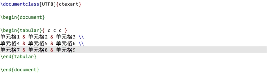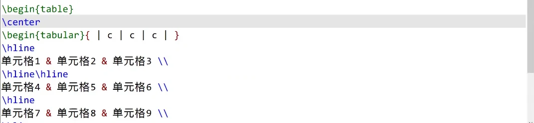 可以使用tabular环境在当前位置创建一个表格,tabular环境要求我们传入一个参数,用来指定表格的尺寸,这里的{ c c c }代表表格一共有三列,其中每一列的内容都居中对齐(centering),可以替换c为l表示左对齐、r表示右对齐