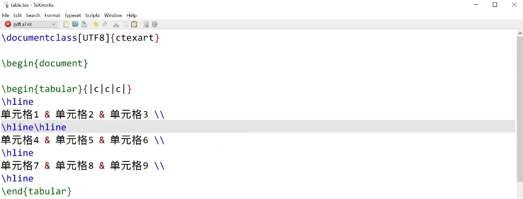 可以在上面加入竖线为表格添加竖直的边框,水平方向的边框则需要通过\hline命令添加,甚至可以输入两次\hline来添加双横线的效果
