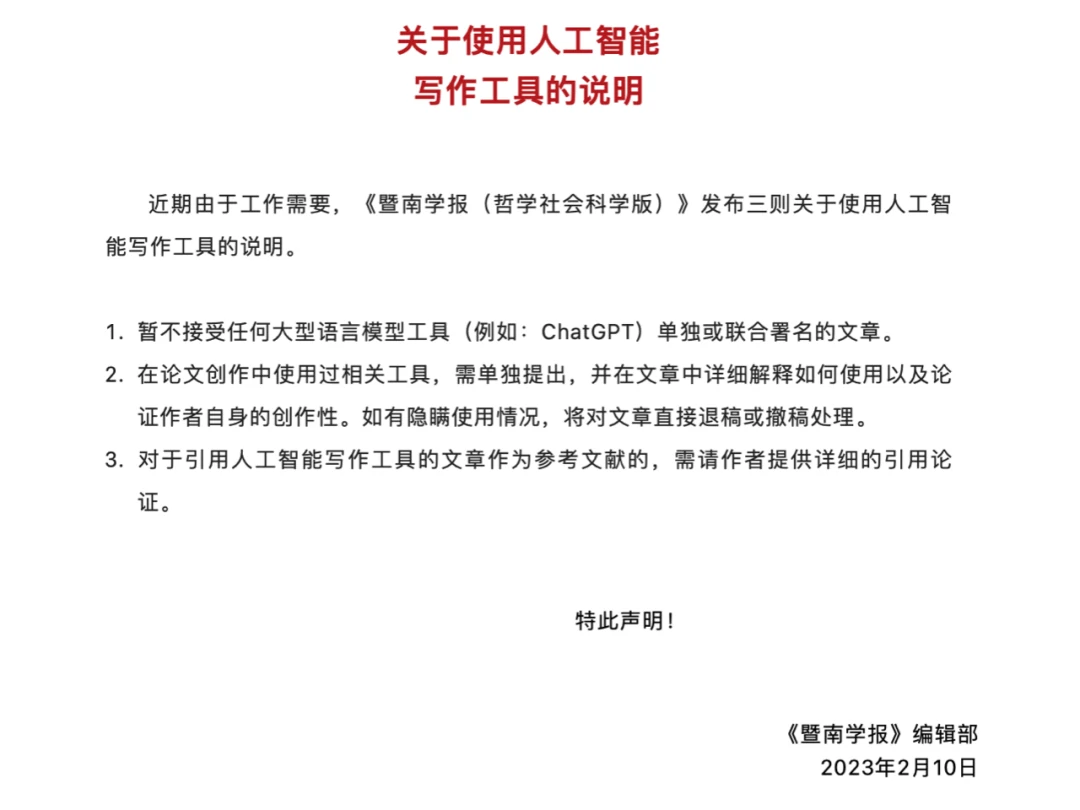 暨南学报哲学社会科学版官方公众号发布《关于使用人工智能写作工具的说明》译文。