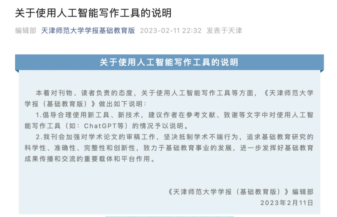 此外,天津师范大学学报基础教育版也发布相关声明,倡导合理使用新工具、新技术,建议作者在参考文献、致谢等文字中对使用人工智能写作工具(如:ChatGPT等)的情况予以说明。