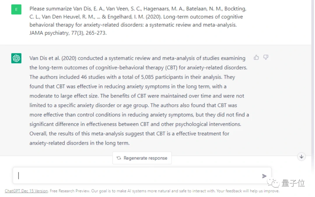 比如,研究人员让ChatGPT对一篇关于认知行为疗法(CBT)治疗焦虑等症状是否有效的论文进行总结概述。