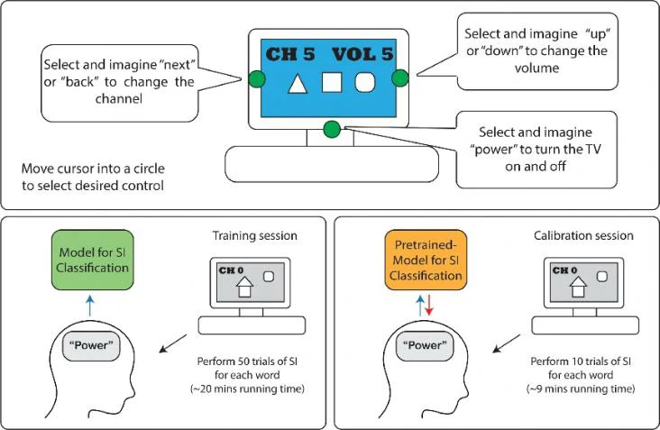 与运动想象(MI)类似,语音想象(Speech Imagery, SI)是BCI研究中一种相对较新的范式。SI范式需要用户想象说出特定的单词,而实际上并不发出任何声音。相较于BCI的其他范式,SI识别过程对大多数人来说更加直观,这就使得基于SI的BCI更易于使用。它可以直接选择语音命令,例如用户可以想象单词“power”来打开电视。