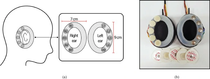 可穿戴耳脑电耳机在用户耳朵周围的八个通道中监测脑电图,如图3。该系统将位于左耳周围的四个声道从上到下命名为L1、L2、L3和L4,将右耳周围的其他四个声道命名为R1、R2、R3和R4。参考(REF)和接地(GND)电极分别位于R4和L4通道下方。