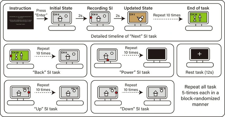 实验II中,每个被试者需要做3个session。在每个session中,参与者被赋予6种不同类型的任务:将音量增加或减少、增加或减少频道、打开或关闭电视以及休息,每个任务需要做10次trial,实验II过程如图6。