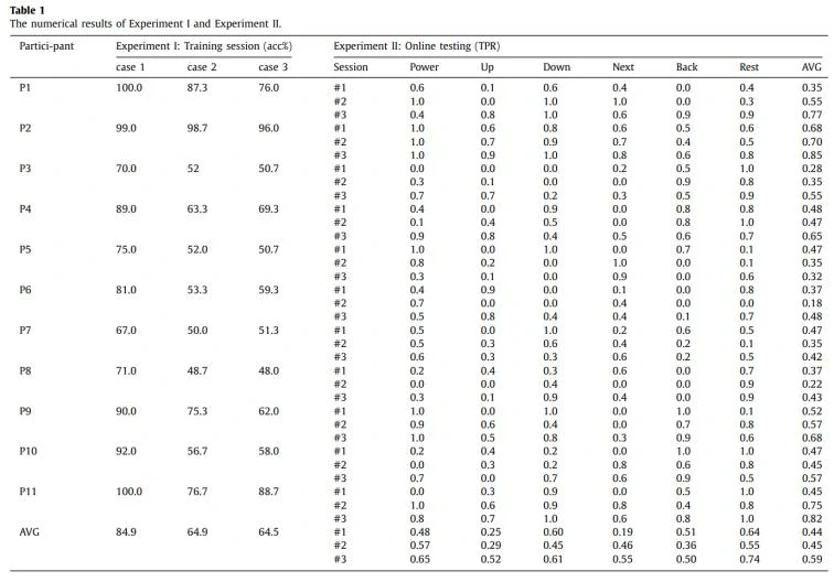 对于实验I,case 1模型对“power”和“rest”类进行分类,case 2模型对“up”、“down”和“rest”类进行分类,case 3模型对“next”、“back”和“rest”类进行分类。所有参与者的平均分类准确率均显著高于平均水平(case 1模型为50%,case 2和3模型为33.3%)。对于case 1、2和3,所有参与者的平均分类准确率分别为84.9%、64.9%和64.5%。