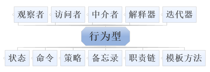 策略模式、责任链模式、命令模式、中介者模式、模板方法模式、迭代器模式、访问者模式、观察者模式、解释器模式、备忘录模式、状态模式