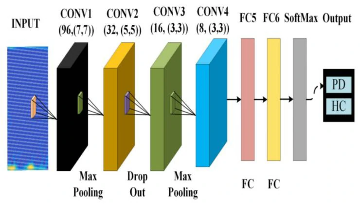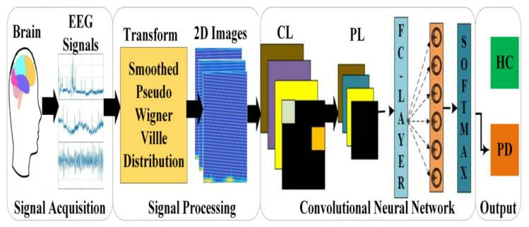 脑电信号(EEG)则因其低幅度、高准确率而被用于PD检测,并广泛应用于其他神经系统疾病辅助诊断、脑功能康复等方面的研究。传统的机器学习方法需要几个人工步骤,如分解、特征提取和分类,但由于脑电信号非线性、非平稳和复杂的性质,手工分析这些信号是很困难的。为了克服这些限制,Khare等人提出了使用平滑伪wigner Ville分布(SPWVD)与卷积神经网络(CNN)(即帕金森病CNN, PDCNNet)相结合的PD自动检测方法。