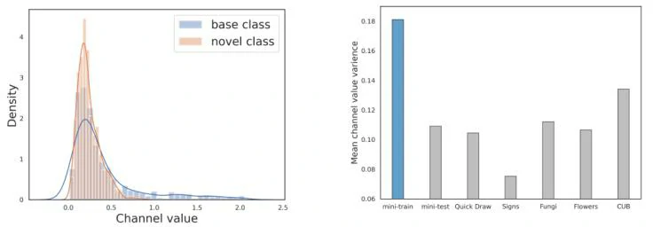 深度学习在图像分类上取得显著进展,然而获取大规模标记数据集的成本却十分昂贵,这使得人们开始关注少样本学习。本研究发现,与基础数据集相比,在新的数据集上提取的特征值会更小和更集中,如图1所示。在这种情况下,使用几何相似性会难以分清通道的重要性。分类将由极少数具有大值的通道主导,而占大部分的小值通道得不到充分利用。举例:狗原型特征为(1, 0.28, 0.2),狼原型特征为(1, 0.25, 0.28),测试图像为(0.8, 0.27, 0.22)。使用余弦距离会误认为测试图像更接近狼原型(距离0.0031)而非狗原型(距离0.0034)。使用特征通道重要性排序则能够区分,测试图像和狗原型具有相同通道排序(1,2,3),而狼原型为(1,3,2)。