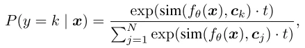 sim()表示相似度函数,fθ为特征提取器,t用于缩放变换。
