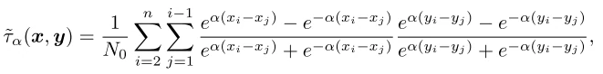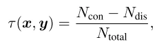 对于两个n维向量,Kendall 的排名相关性系数可以定义为表现出一致排序与不一致排序的通道对 (xi, xj) 和 (yi, yj) 之间的差异,即: