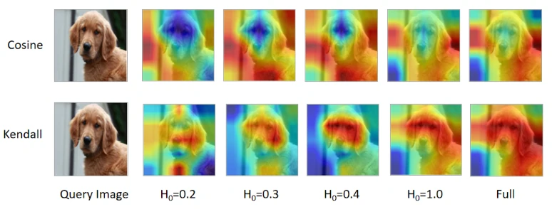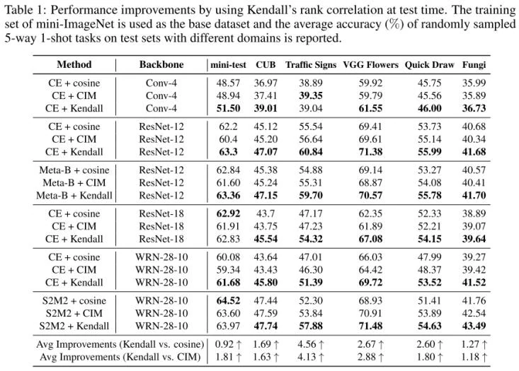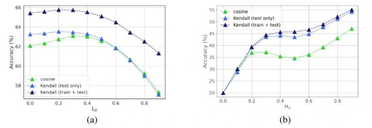 本研究先验证了使用Kendall相关性系数相对于余弦相似度的提升,如表1所示,可见仅在测试阶段将最初使用的余弦相似度替换为Kendall秩相关性就能在多个数据集上取得提升。
