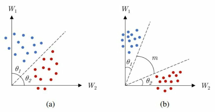 其中 x 是特征向量,W_1 和 W_2 是对应每类的权重,θ_1 和 θ_2 是 x 分别与 W_1 和 W_2 之间的角度。通过在上式中引入一个乘法余量,这两个决策边界可以变得更加严格: