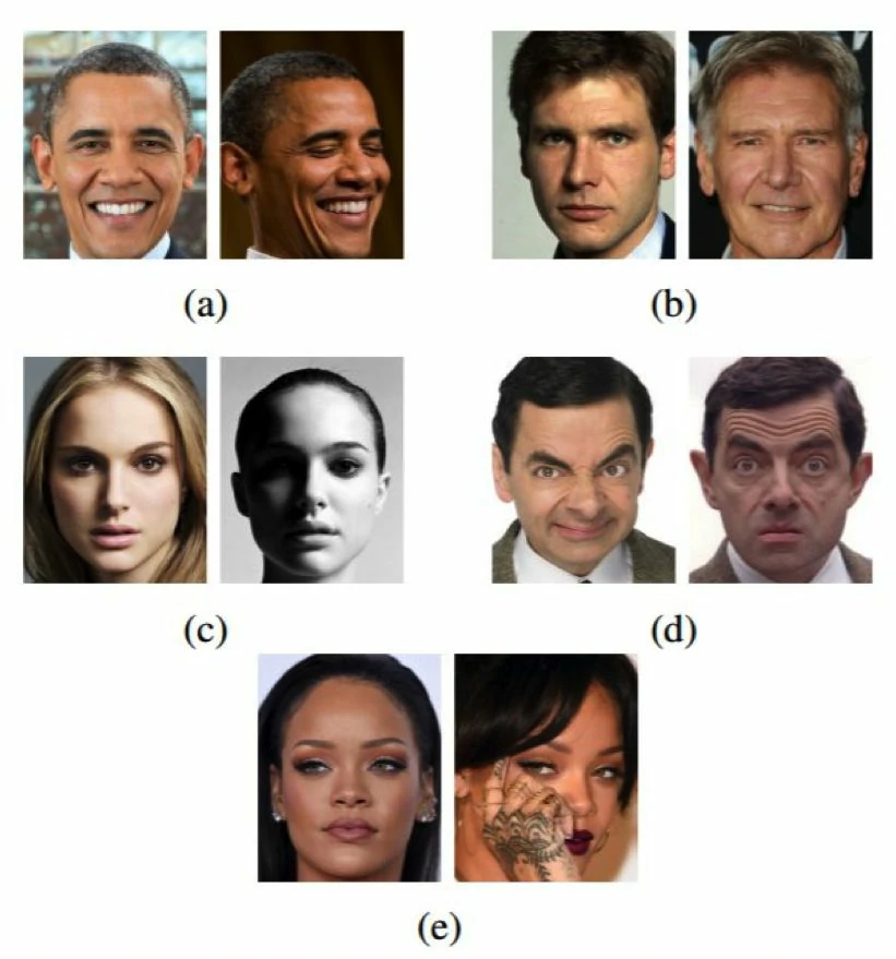 当被部署在无约束条件的环境中时,由于人脸图像在现实世界中的呈现具有高度的可变性(这类人脸图像通常被称为自然人脸(faces in-the-wild)),所以人脸识别也是最有挑战性的生物识别方法之一。人脸图像可变的地方包括头部姿势、年龄、遮挡、光照条件和人脸表情。图 1 给出了这些情况的示例。