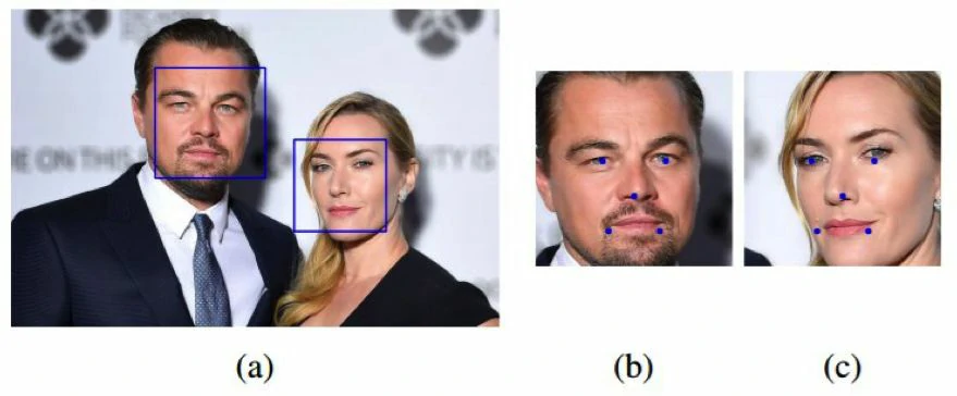 - 人脸检测。人脸检测器用于寻找图像中人脸的位置,如果有人脸,就返回包含每张人脸的边界框的坐标。如图 3a 所示。